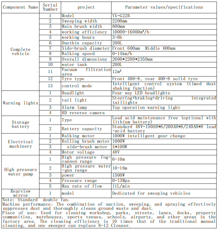 استعمال کی جگہ: ورکشاپ ، پارکس ، گلیوں ، گلیوں ، ڈاکوں ، پراپرٹی کمیونیٹیٹس ، گوداموں ، کھیلوں کے مقامات ، اسکولوں ، ہوائی اڈوں اور دیگر علاقوں میں دیگر علاقوں میں صفائی ستھرائی کے لئے استعمال کیا جاتا ہے۔ صفائی کی کارکردگی روایتی دستی کلیننگ سے 10 گنا زیادہ ہے ، اور ایک سویپر 8-12 کلینر کی جگہ لے سکتا ہے۔